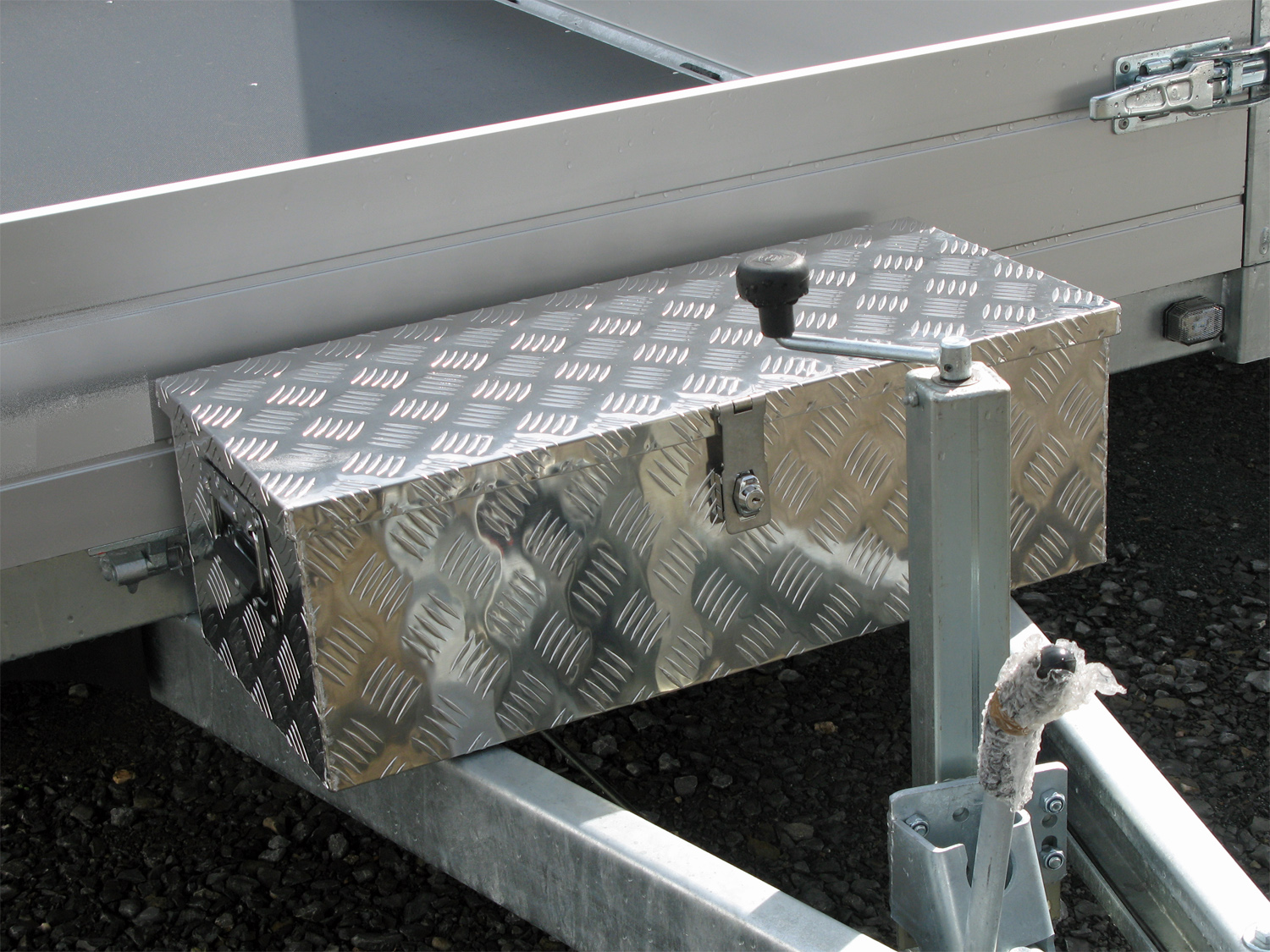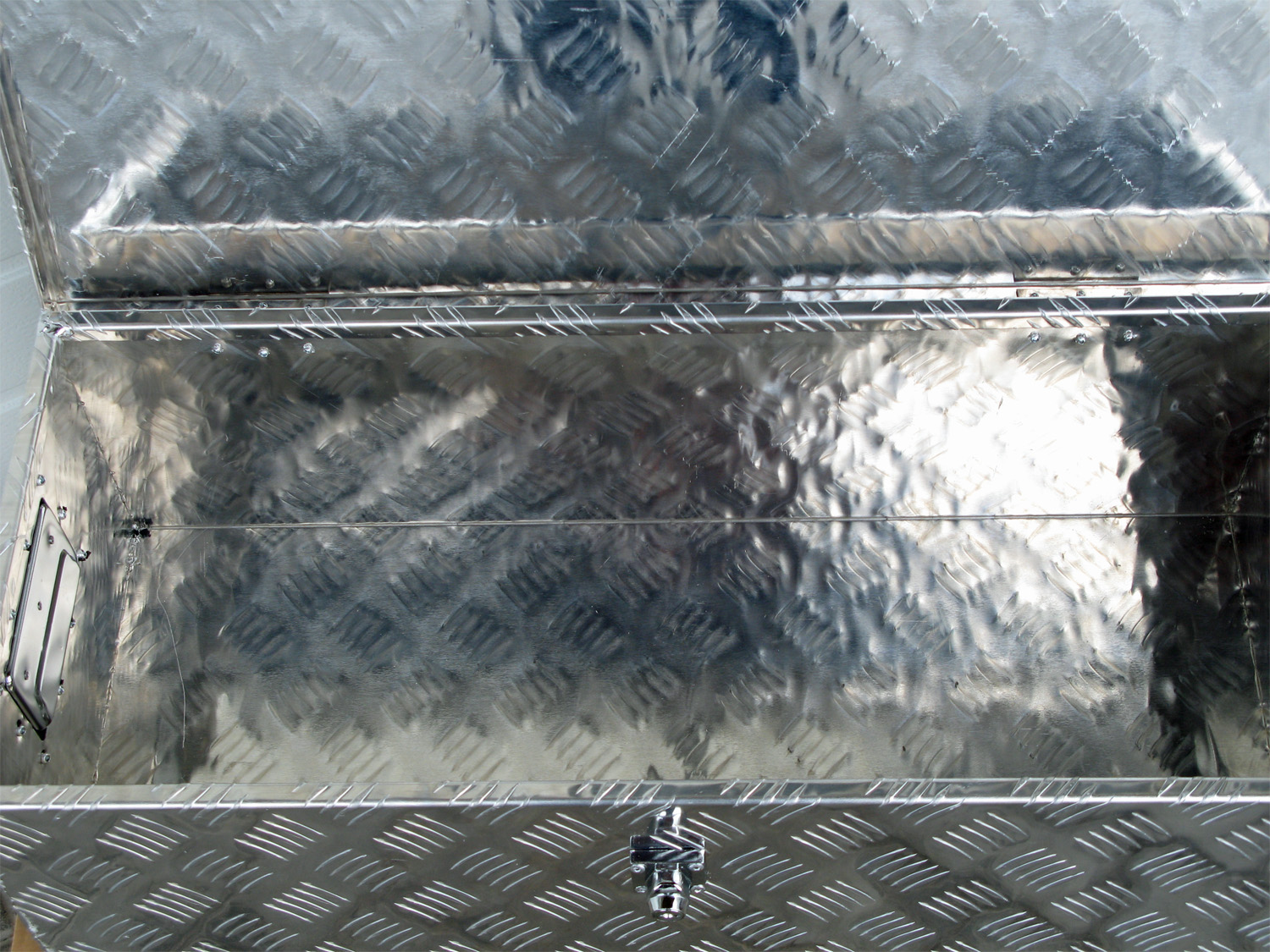 Stabile Aluminium Transportbox mit 60 Liter Volumen. Als Transportbox und auch als Deichselbox zu verwenden. Aus stabilem Quintett Riffelblech gefertigt. Bügelschloß Vorrichtung zur Diebstahlsicherung, abschließbar incl. Schloß u Schlüssel