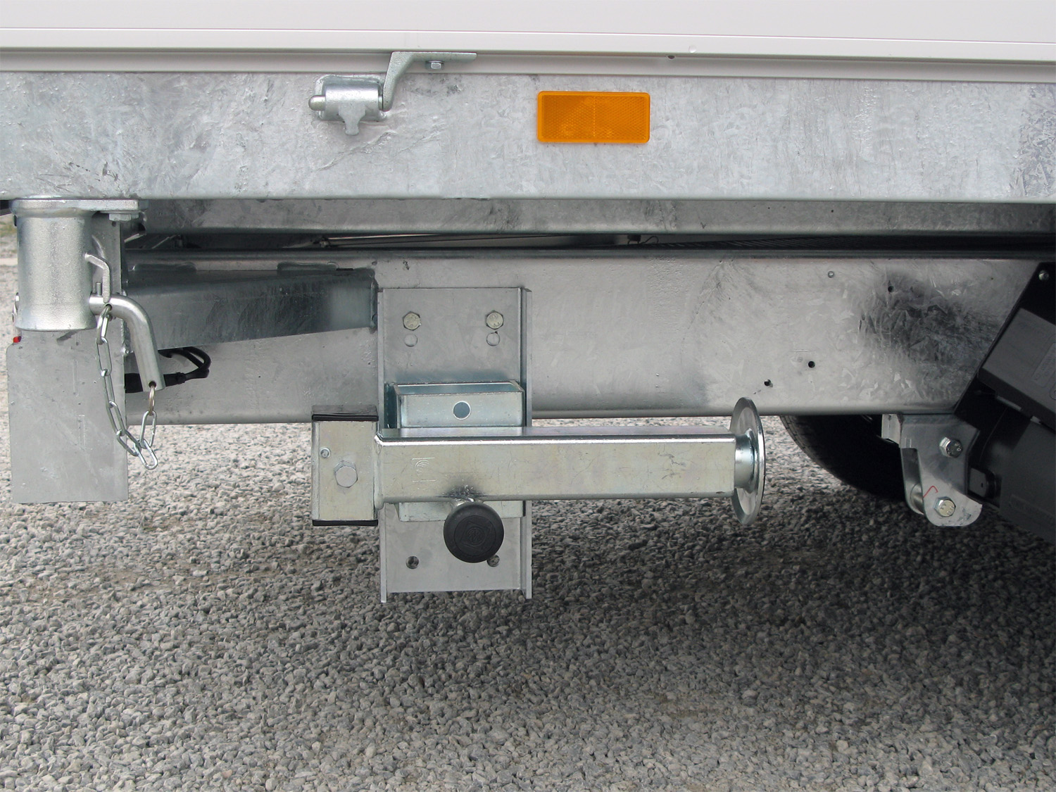 Parabelfederung incl. Stoßdämpfer, schwarze Felgen 3-Seiten-Kipper mit Hydraulikzylinder und Elektrische Bedienung mit Batterie. Niedriges Fahrwerk (Ladebodenhöhe von 69 cm) mit Bereifung 195/50 R13