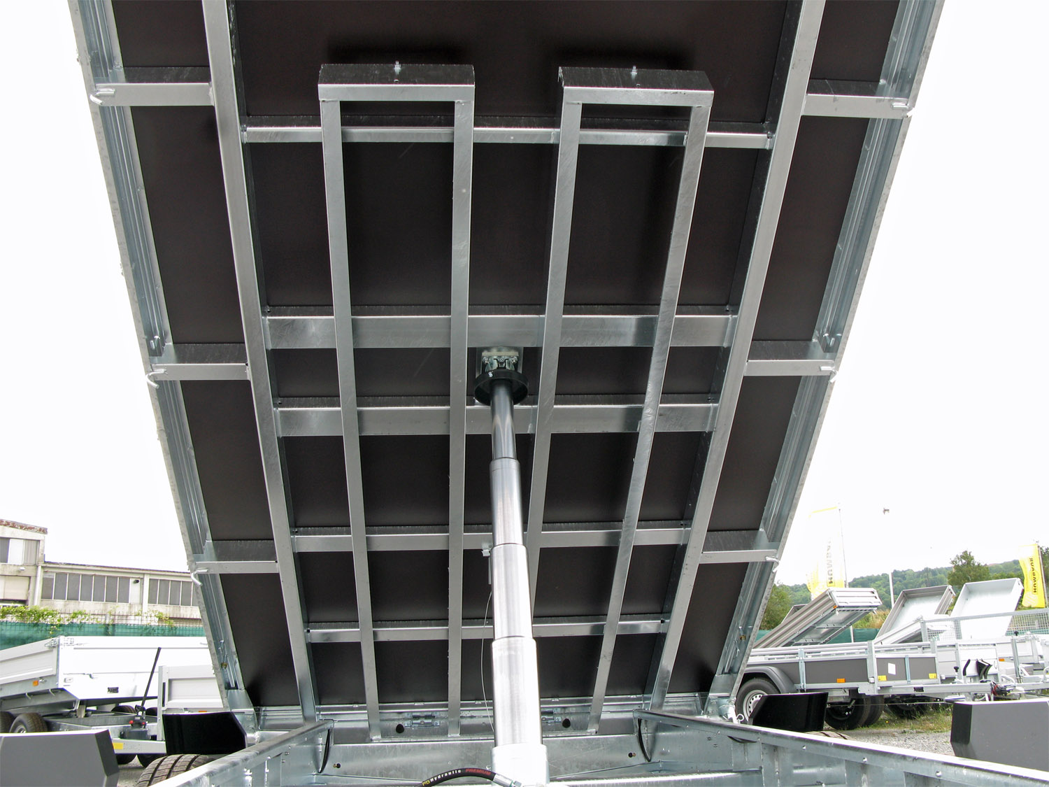 3-Seiten-Kipper mit Hydraulikzylinder und elektrischer Bedienung mit Batterie.