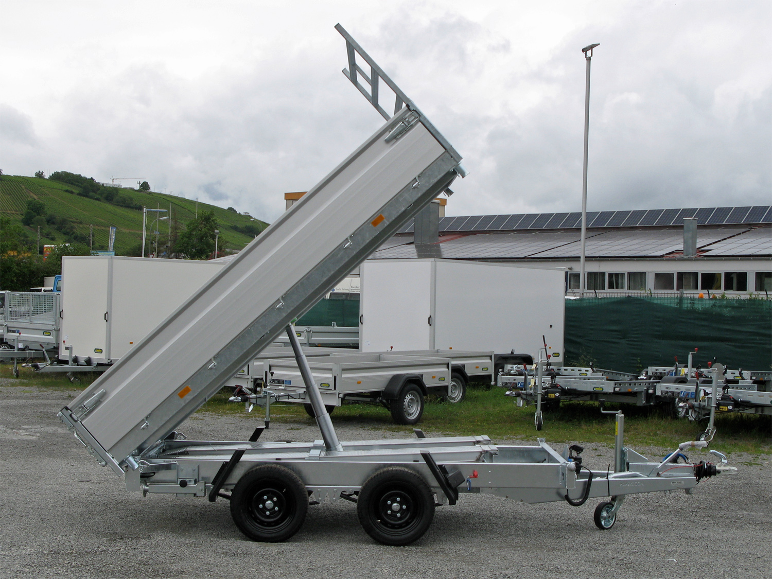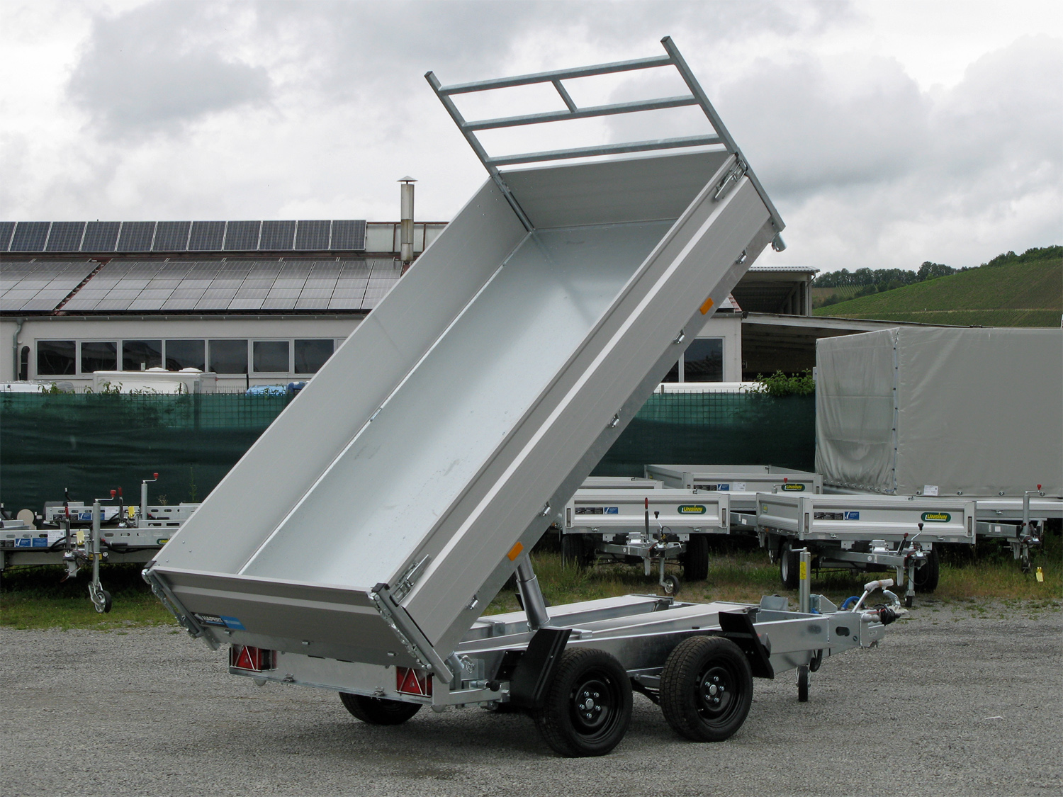 3-Seiten-Kipper mit Hydraulikzylinder ,elektrischer Bedienung mit Batterie. Nothandpumpe