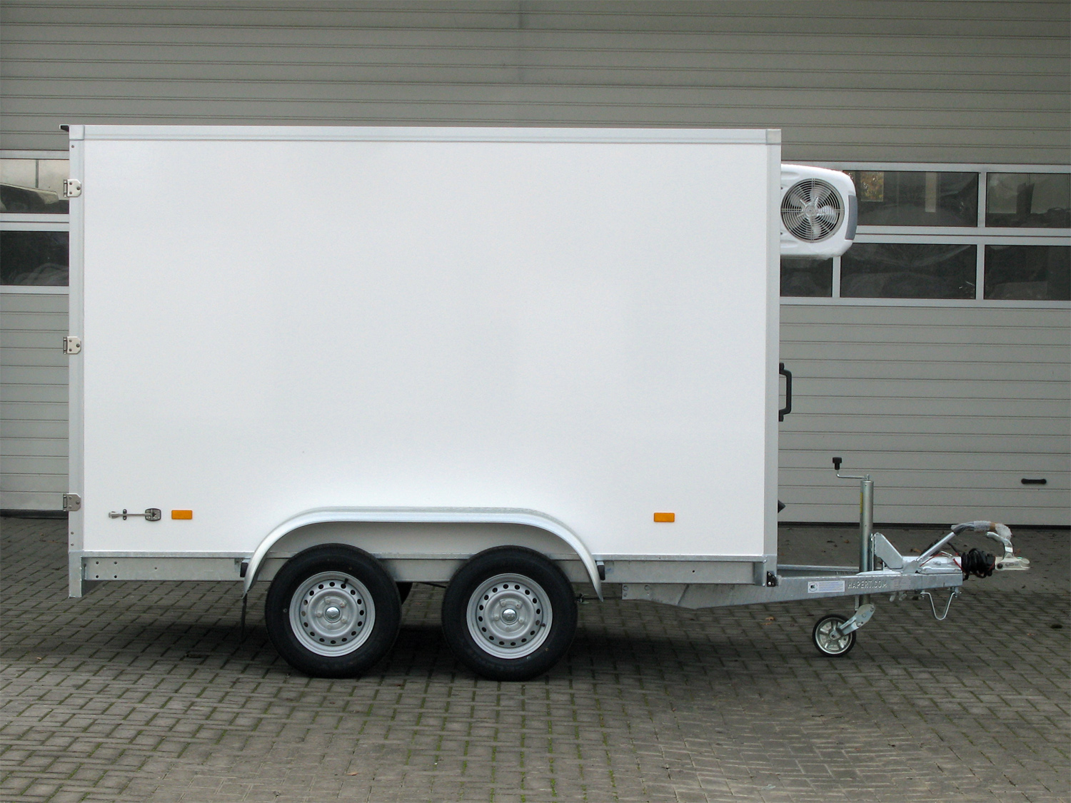 Der Anhänger verfügt über Scharniere und Verschlüsse aus Edelstahl. An der Vorderseite ist ein leistungsfähiges Kühlaggregat in einem robusten Gehäuse angeordnet. Auch ein Verlängerungskabel mit Netzstecker, Innenbeleuchtung und eine abschließbare Bedienkonsole gehören zur Serienausstattung. Kurz gesagt, ein voll ausgestatteter Kühlwagen, dessen glatte Gelcoat-Außenwände sich außerdem auch noch gut zur Anbringung von Aufklebern eignen, sodass Sie mit dem Kühlwagen gleichzeitig Werbung machen können!