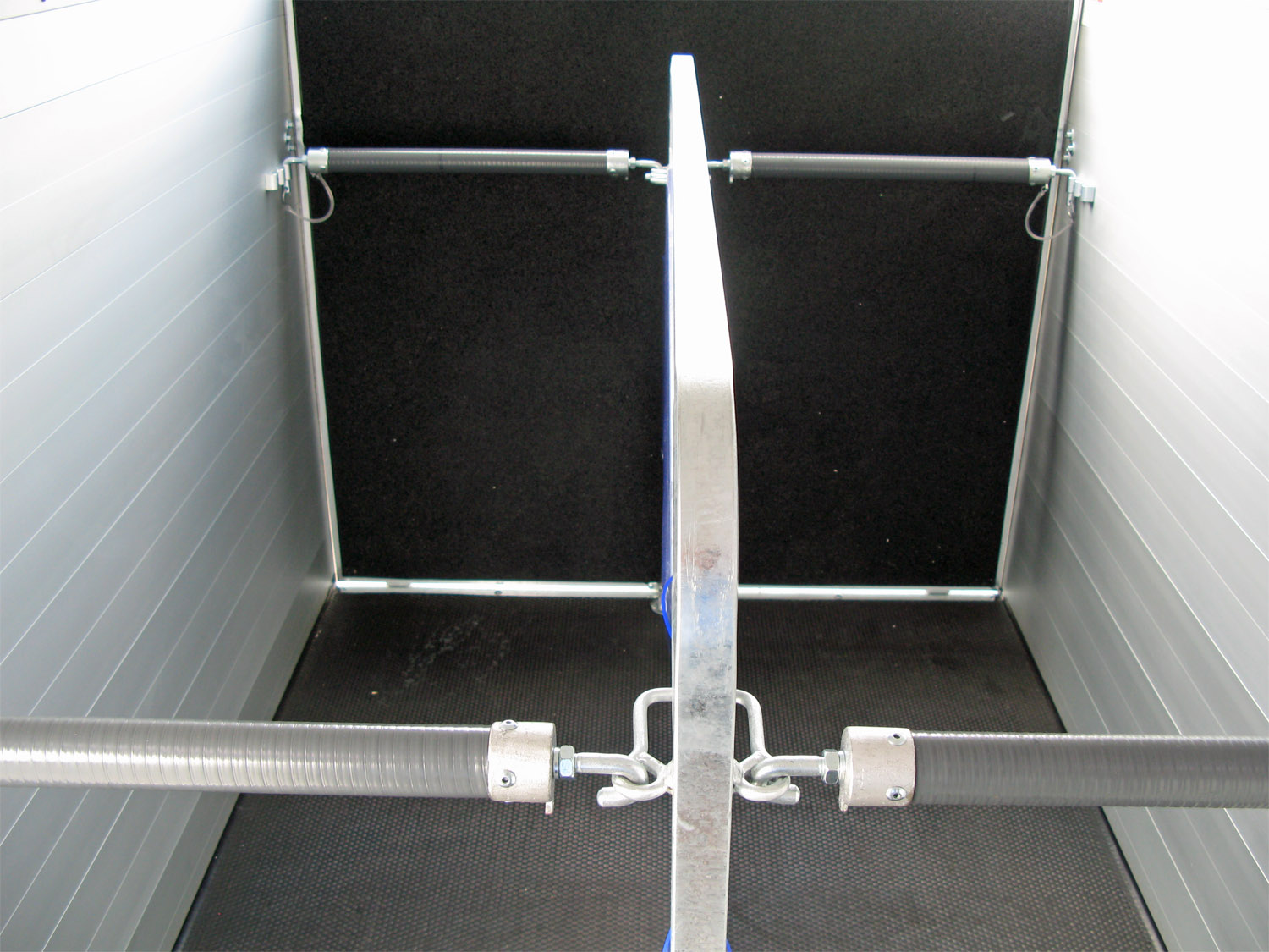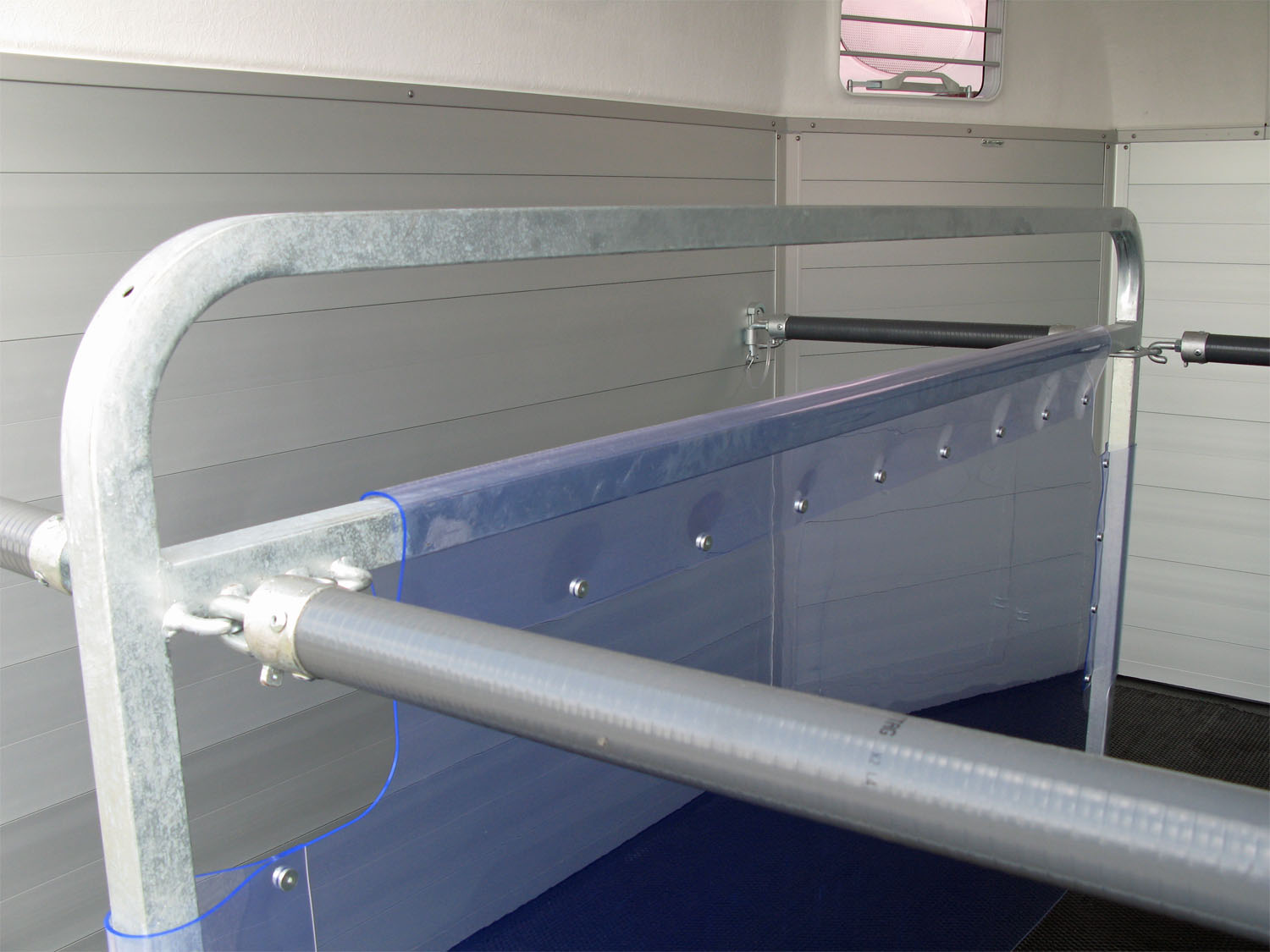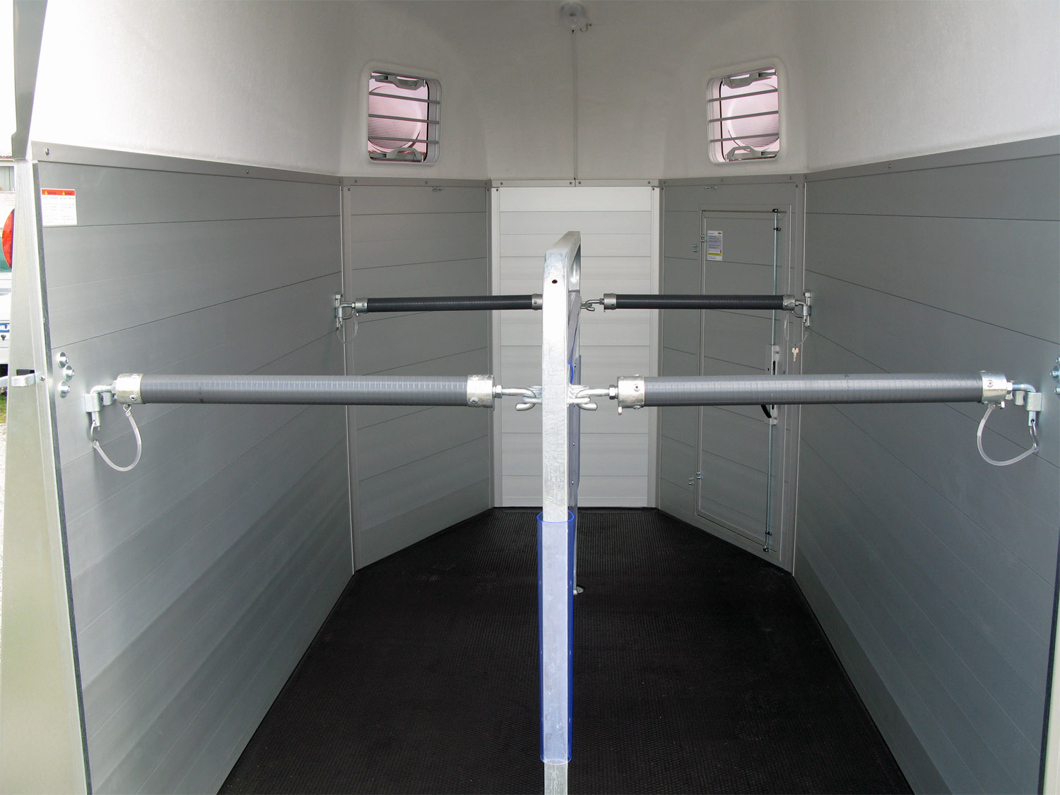 Die Pferde profitieren von den geteilten Brust- und Heckstangen mit Panikentriegelung, den getönten Ausstellfenstern in der Polyhaube und dem Windschott, das für zugfreie Innenraumbelüftung sorgt. Die verriegelbare Trennwand EquiLock® lässt sich leicht bedienen und sorgt für sicheren Halt auch bei geöffneter Heckklappe.