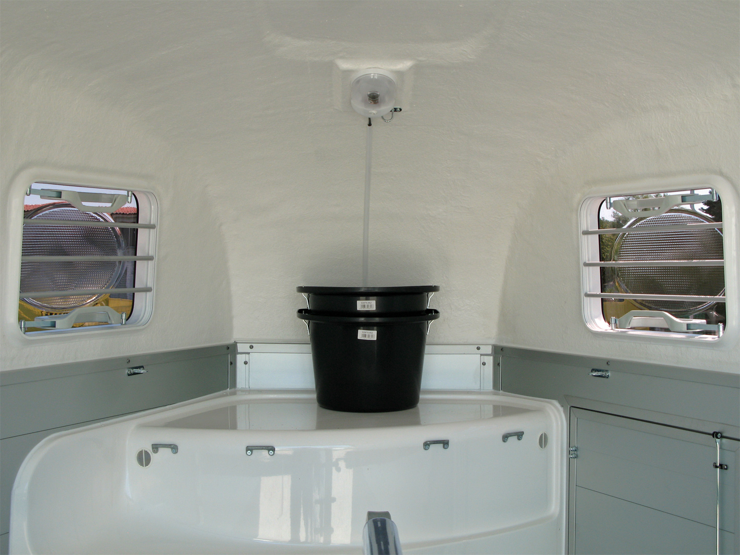 Die Pferde profitieren von den geteilten und höhenverstellbaren Brust- und Heckstangen mit Panikentriegelung, den getönten Ausstellfenstern in der Polyhaube und dem Windschott, das für zugfreie Innenraumbelüftung sorgt. Die verriegelbare Trennwand EquiLock® lässt sich leicht bedienen und sorgt für sicheren Halt auch bei geöffneter Heckklappe.