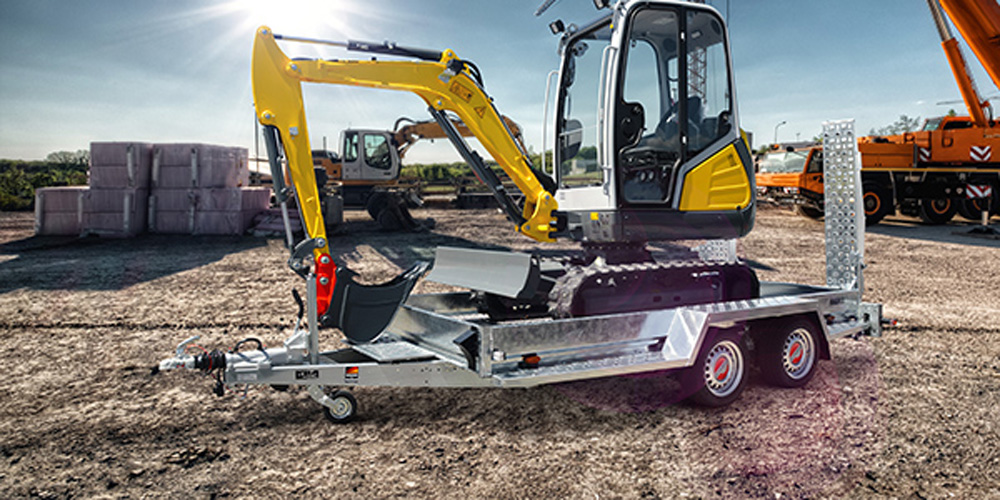 Für jeden Einsatz. Der universell einsetzbare STEMA-Baumaschinentransporter ist der ideale Begleiter für den gewerblichen Einsatz. Baumaschinen und andere Arbeitsgeräte lassen sich durch den extrem niedrigen Auffahrwinkel (18°) über die stabilen Auffahrrampen (1,70 m lang) mühelos verladen. Die Ladehöhe beträgt ca. 46 cm.