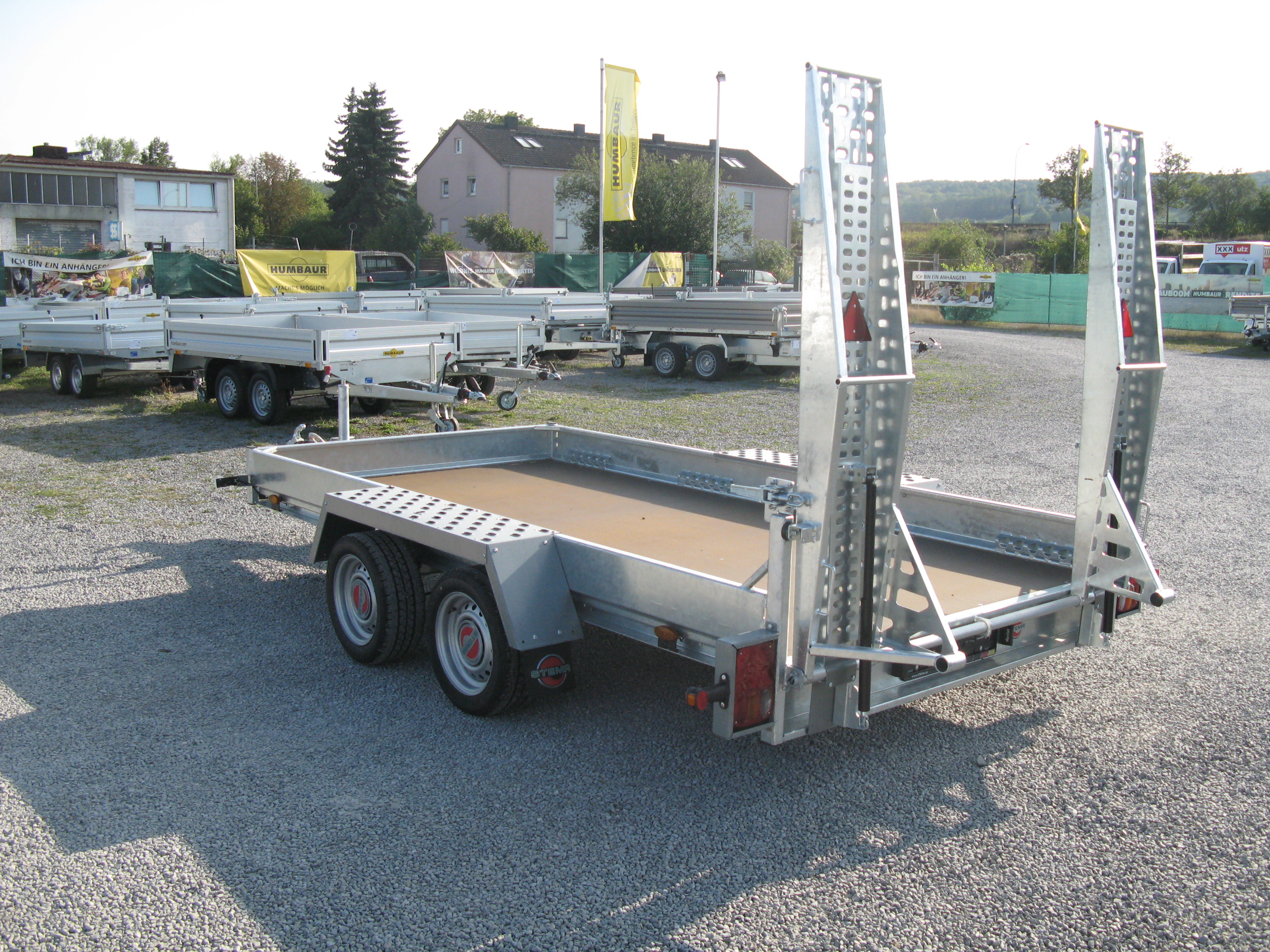Für jeden Einsatz. Der universell einsetzbare STEMA-Baumaschinentransporter ist der ideale Begleiter für den gewerblichen Einsatz. Baumaschinen und andere Arbeitsgeräte lassen sich durch den extrem niedrigen Auffahrwinkel (18°) über die stabilen Auffahrrampen (1,70 m lang) mühelos verladen. Die Ladehöhe beträgt ca. 46 cm.