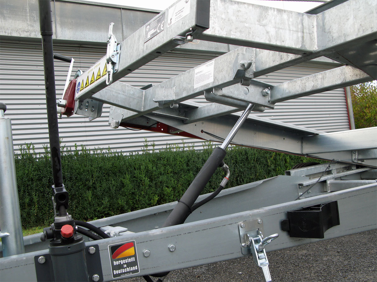 - Hydraulische doppelwirkende Handpumpe zum problemlosen An- und Abkippen des Anhängeraufbaus.