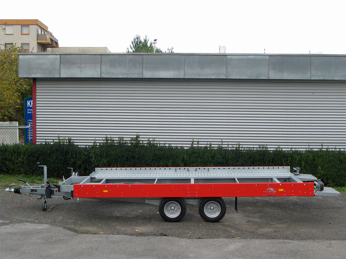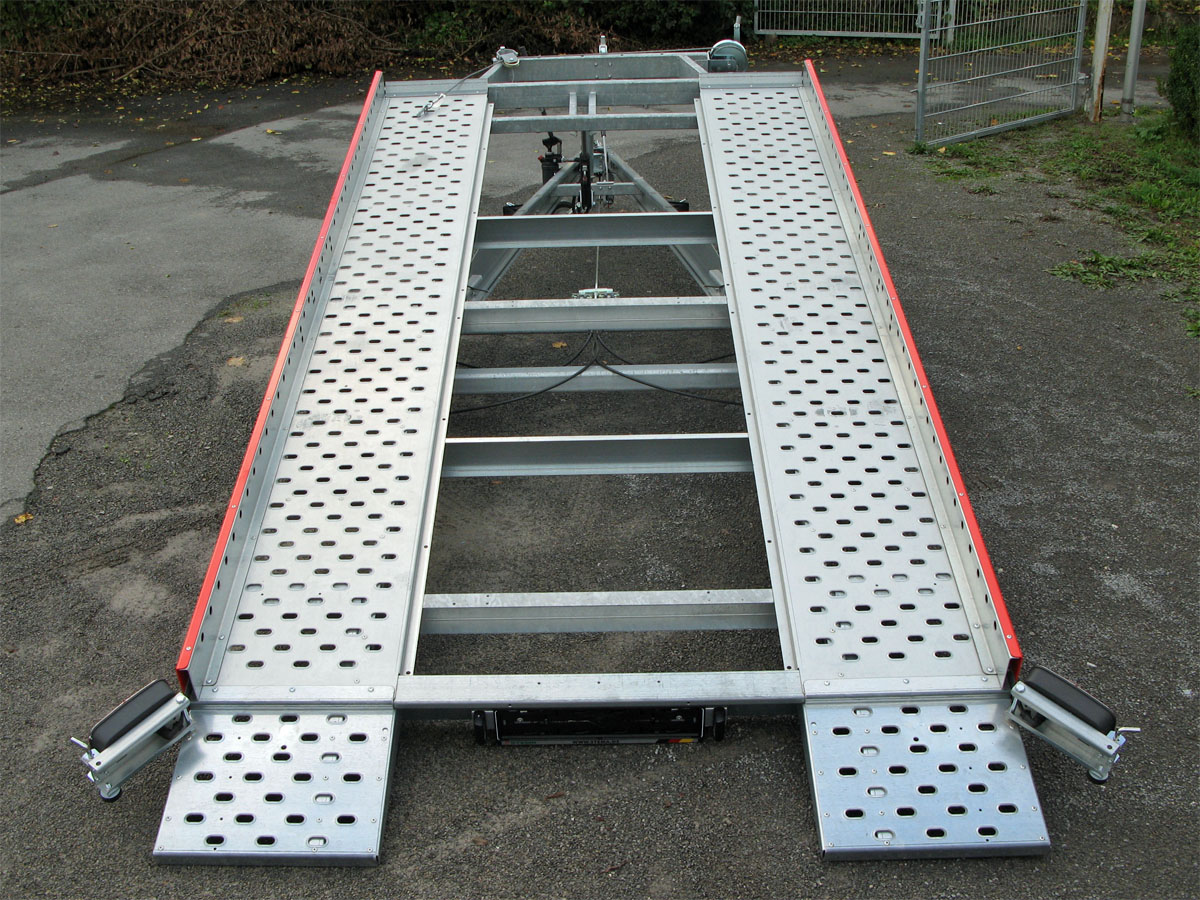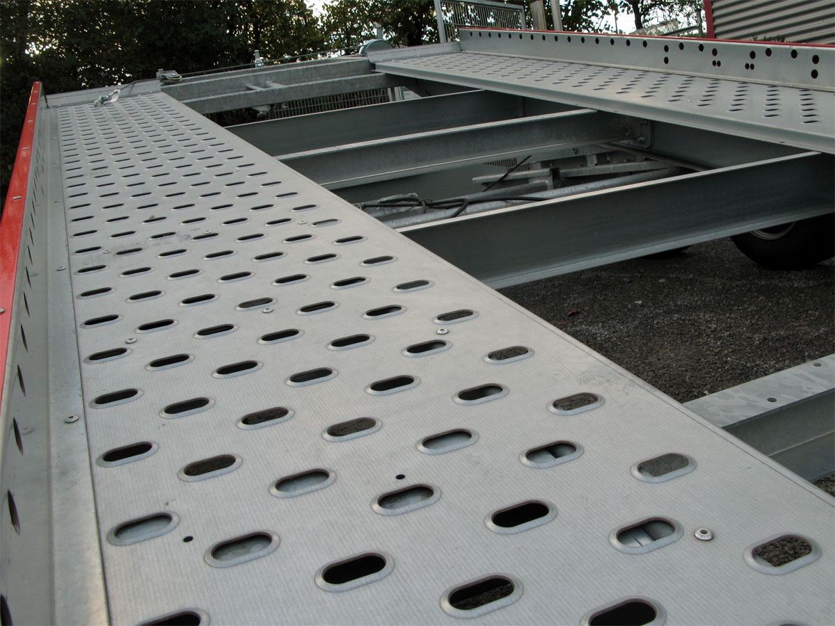 - Extrabreite, gelochte, rutschfeste Laufschienen aus Zinkblech mit großen Langlöchern zum sicheren Fixieren der Spanngurte . Die überbreite Laufschiene ermöglicht den problemlosen Transport von Fahrzeugen mit verschiedenen Radständen. Angebaute Auffahrschienen sorgen für ein einfaches Be- und Entladen.