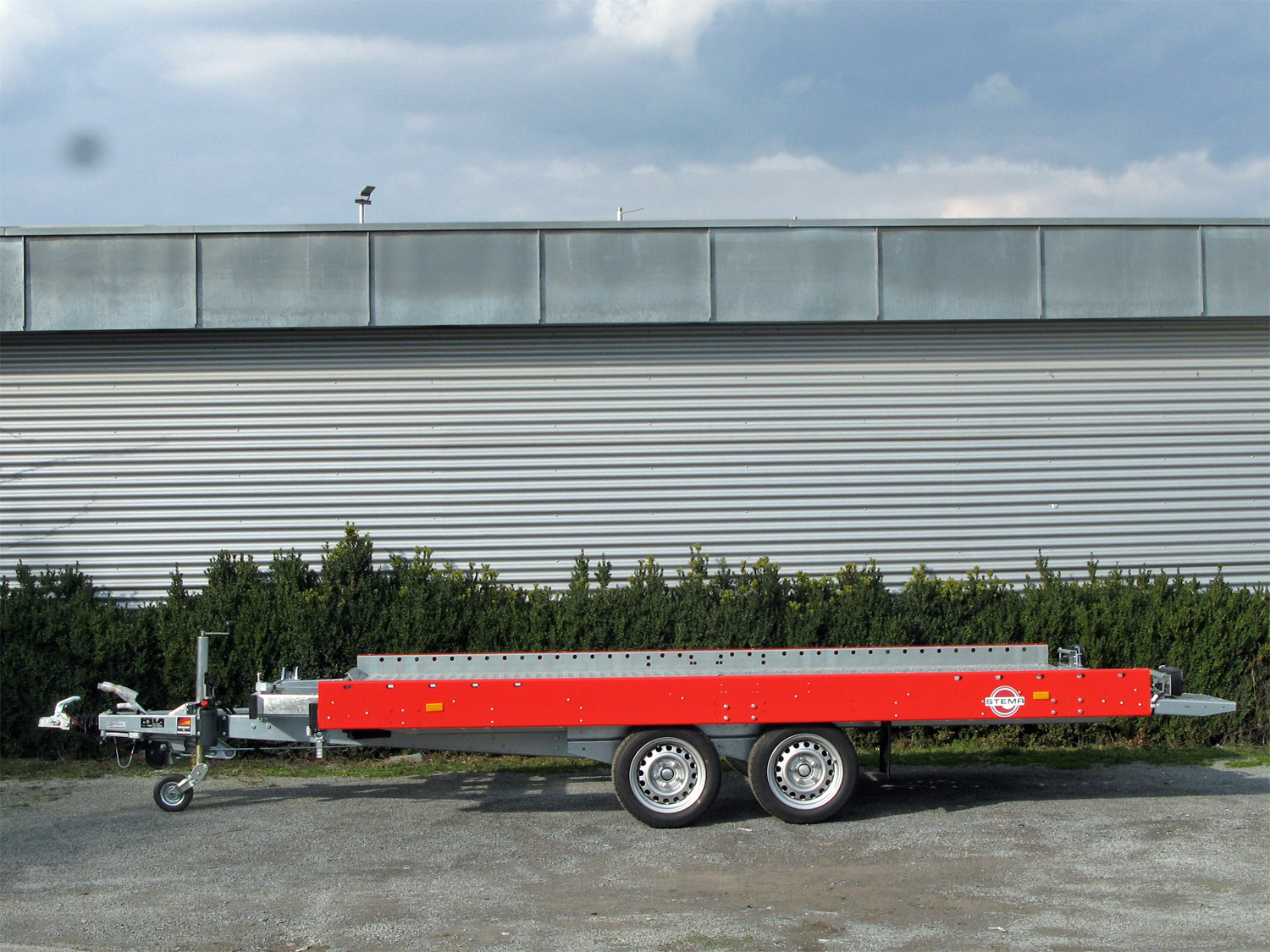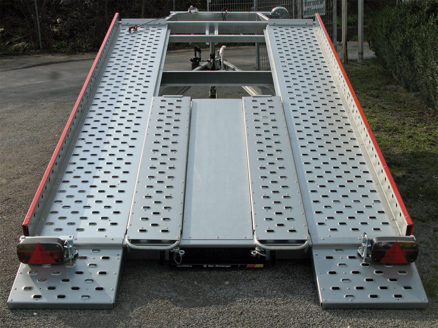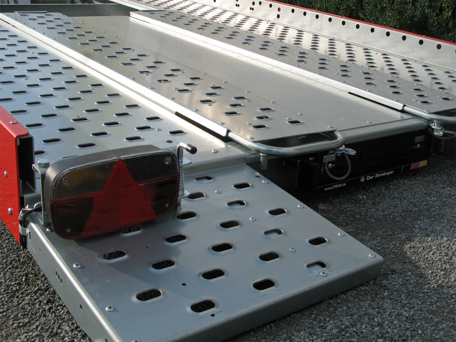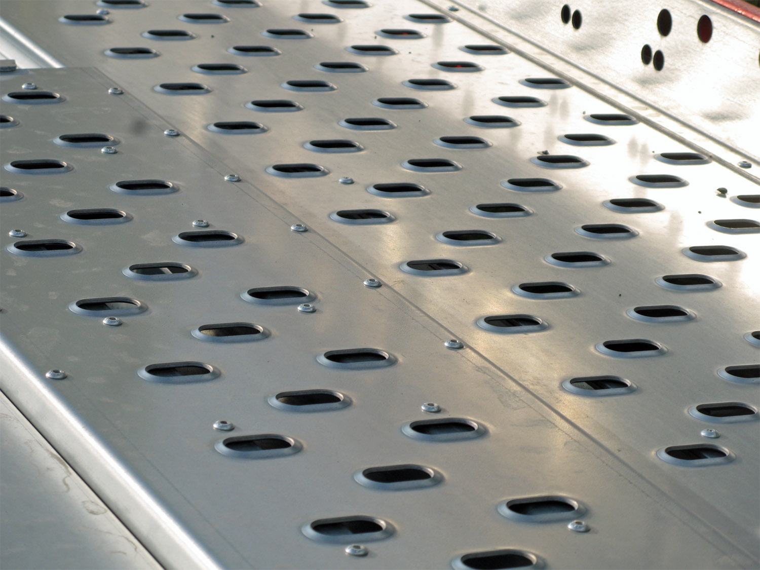 - Extrabreite, gelochte, rutschfeste Laufschienen aus Zinkblech mit großen Langlöchern zum sicheren Fixieren der Spanngurte . Die überbreite Laufschiene ermöglicht den problemlosen Transport von Fahrzeugen mit verschiedenen Radständen. Angebaute Auffahrschienen sorgen für ein einfaches Be- und Entladen.