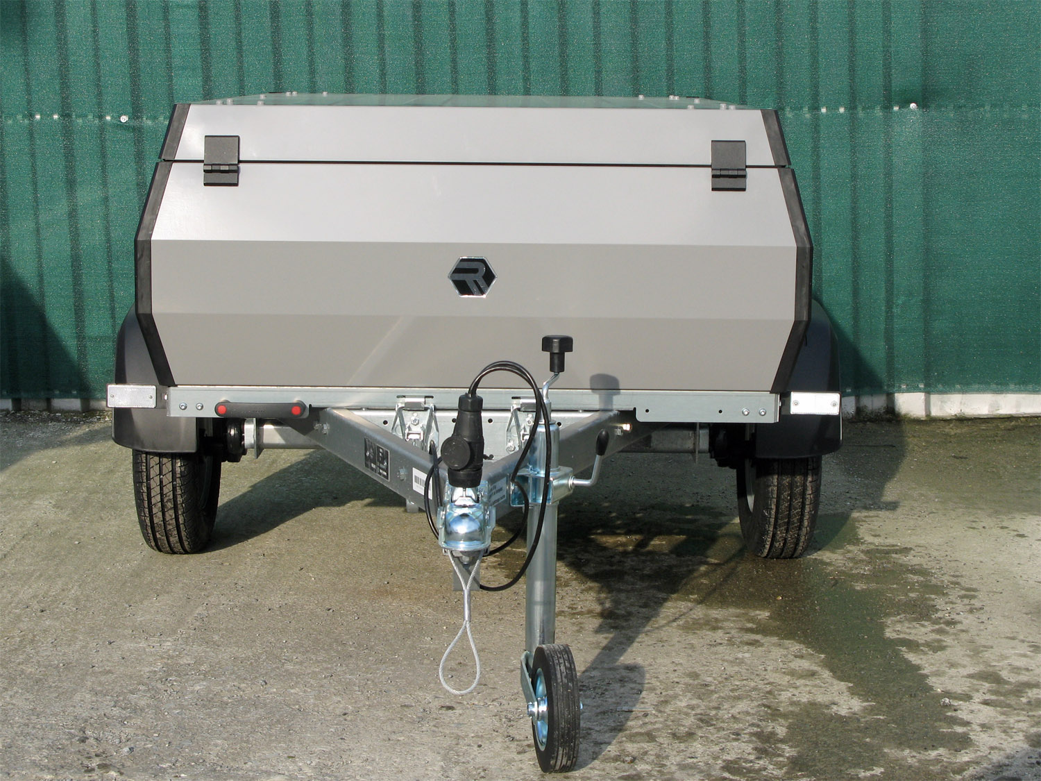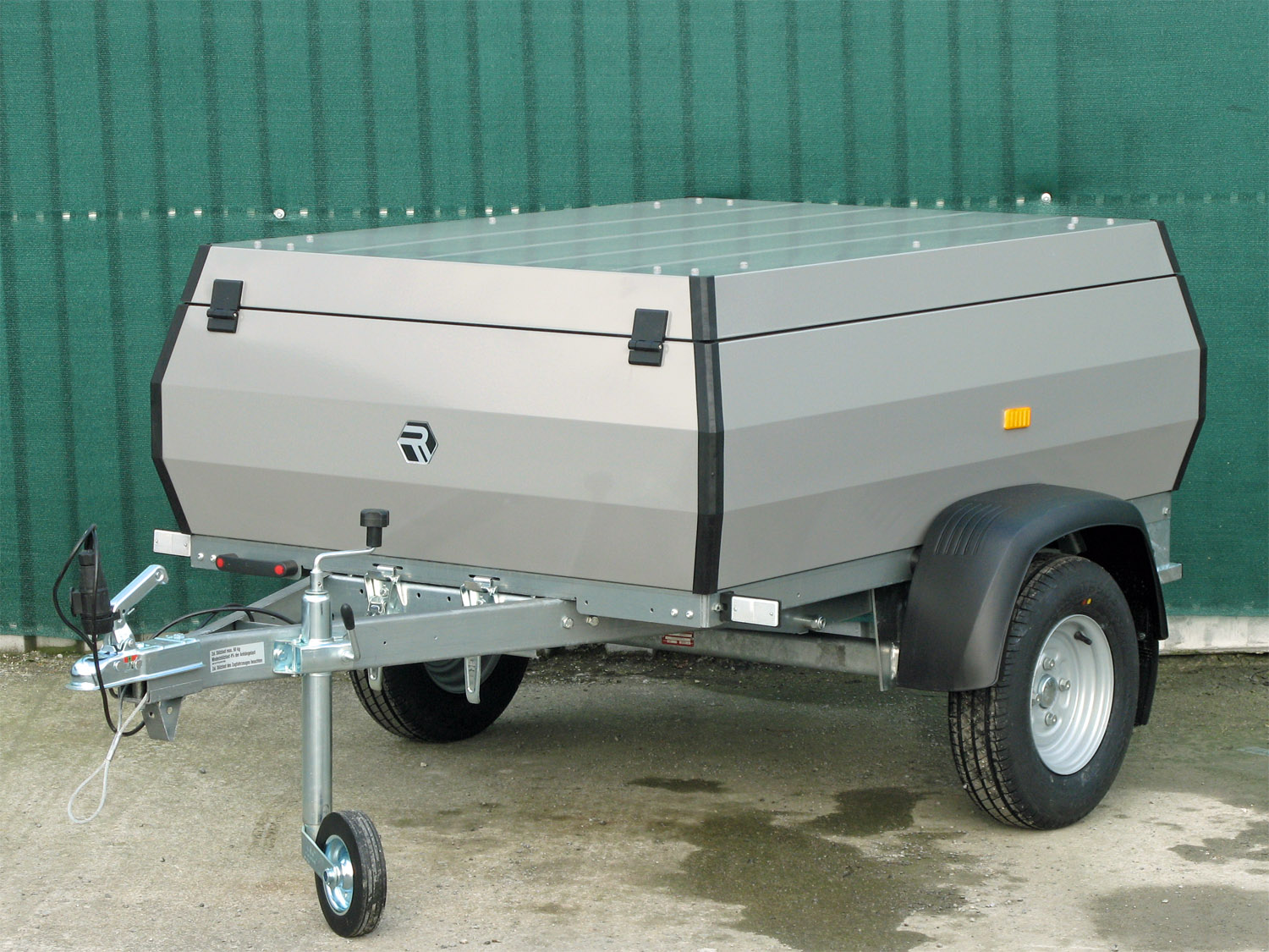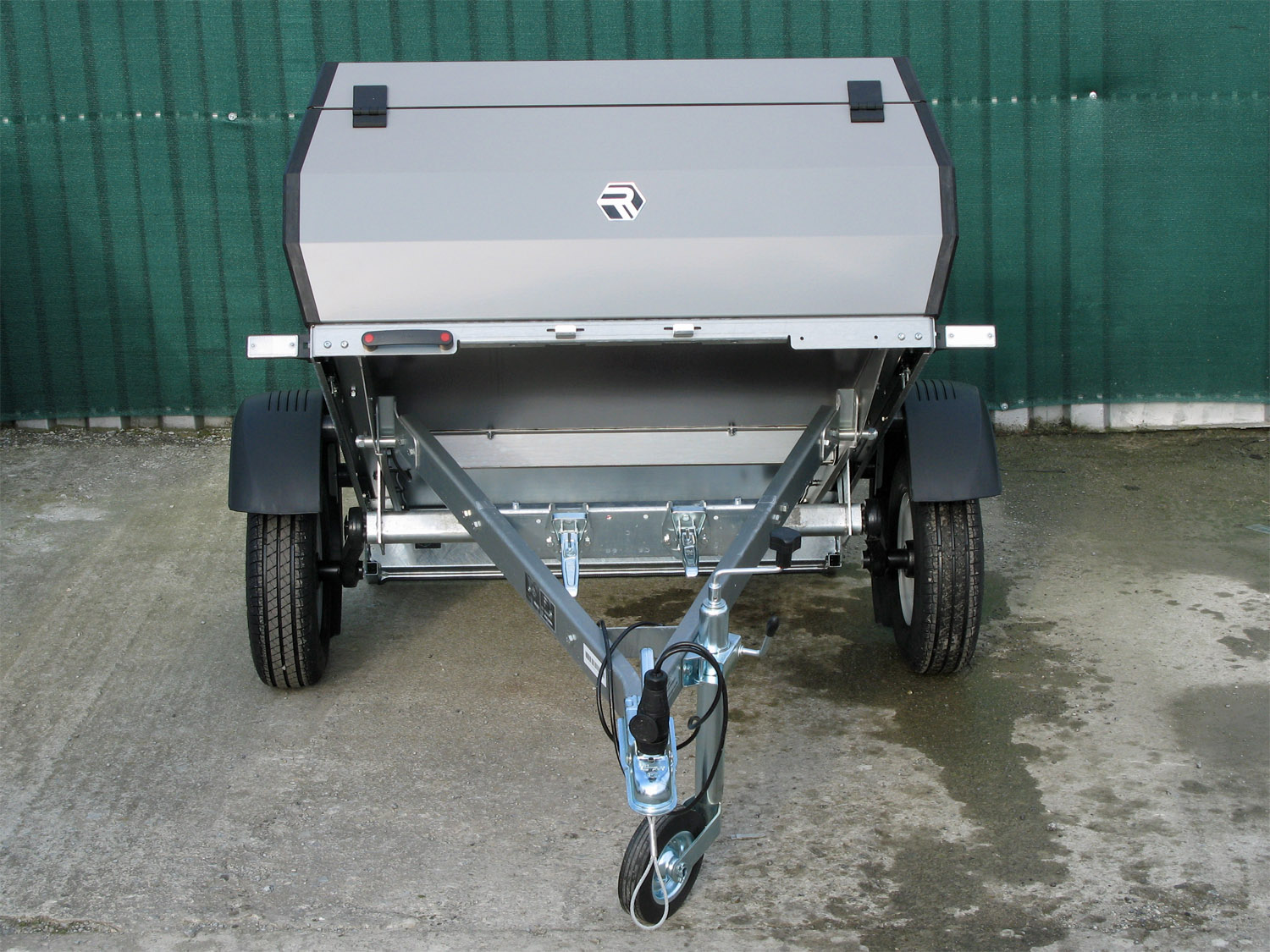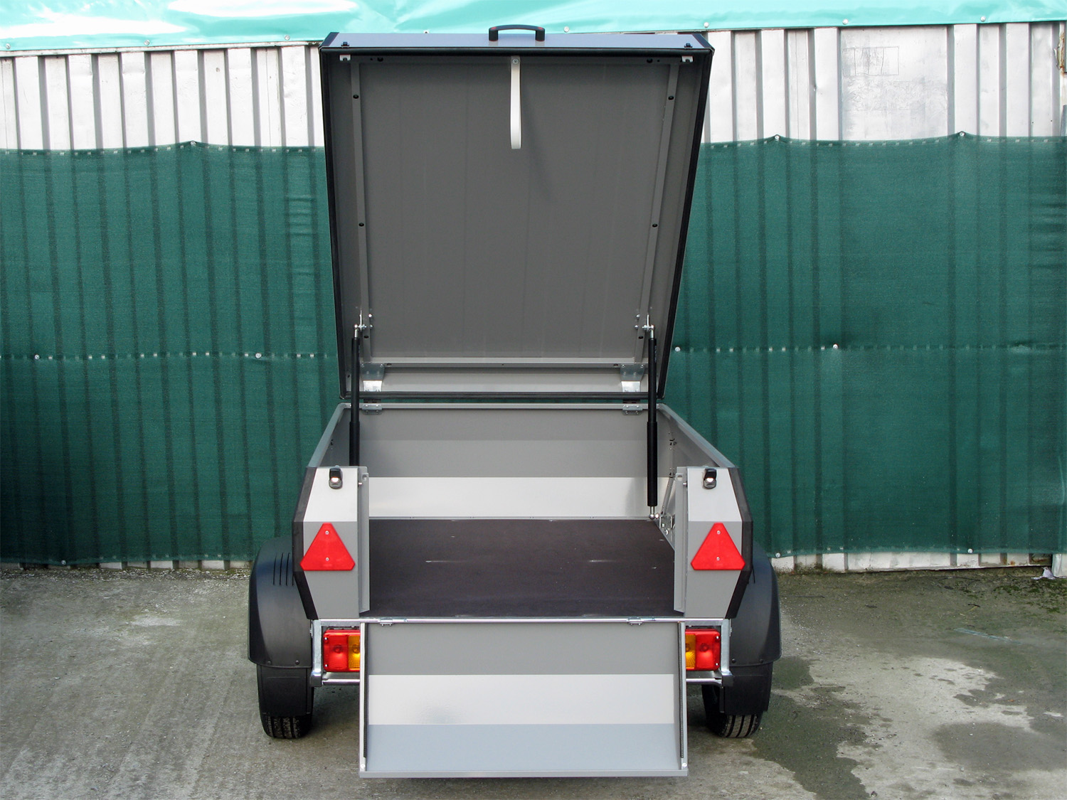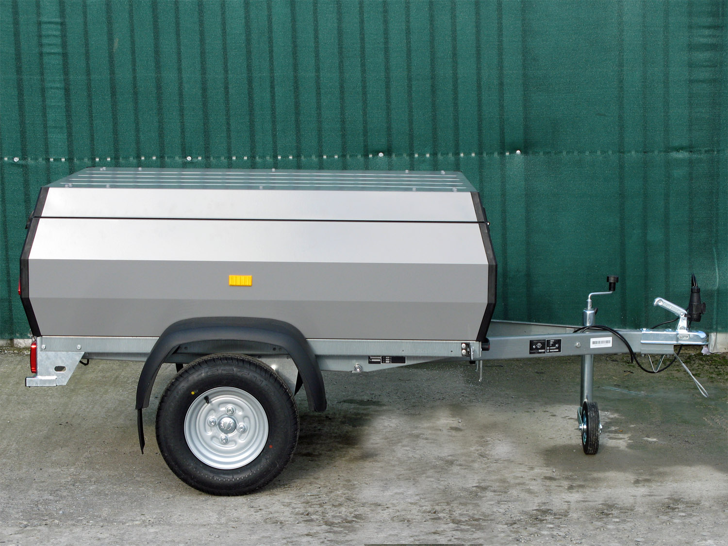 Desweiteren reduziert sich beim Aufstellen des Anhängers in der Garage das lichte Höhemaß von 253 cm auf 170 cm. Der Kastenkorpus mit Deckel ist spritzwasserdicht. Kasten und Deckel können in vielen RAL Farben pulverbeschichtet werden. Die Kombination der zweifarbigen Pulverbeschichtung von Deckel und und Kasten ist ebenfalls möglich.