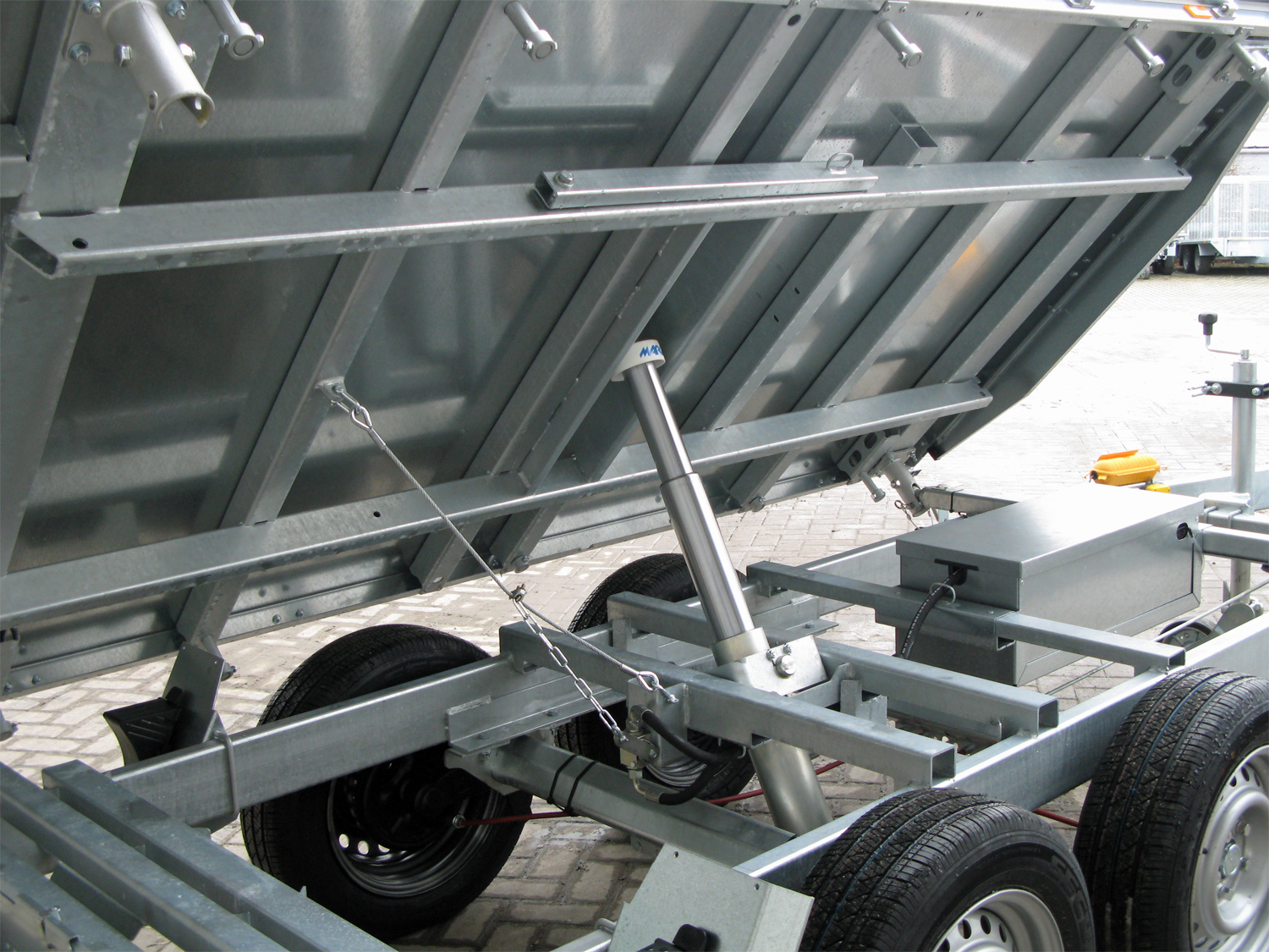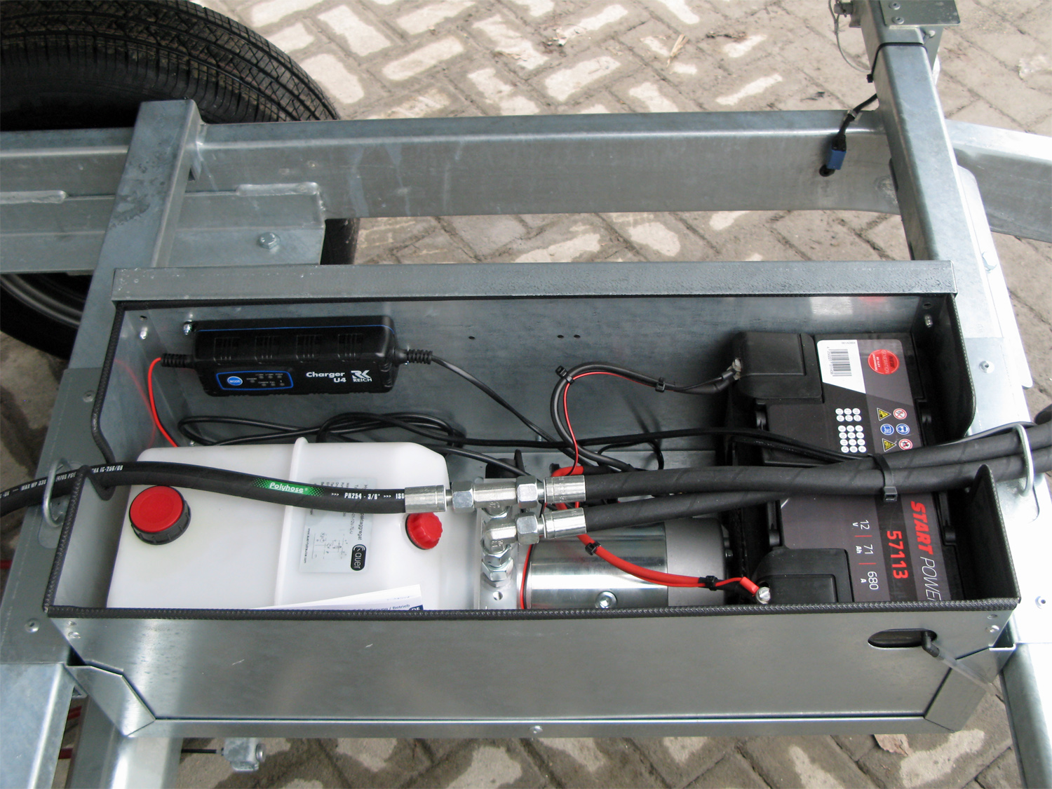 Aktionsmodell mit Stahlboden, Hakenverschlüssen und E-Pumpe, Stahlboden, Alubordwände 350mm, Heckbordwand abklappbar mit Stahlbeplankung, E Hydraulik mit Notpumpe Pumpless, Rampenschacht incl. klappbarem Kennzeichenhalter, Wartungsstütze