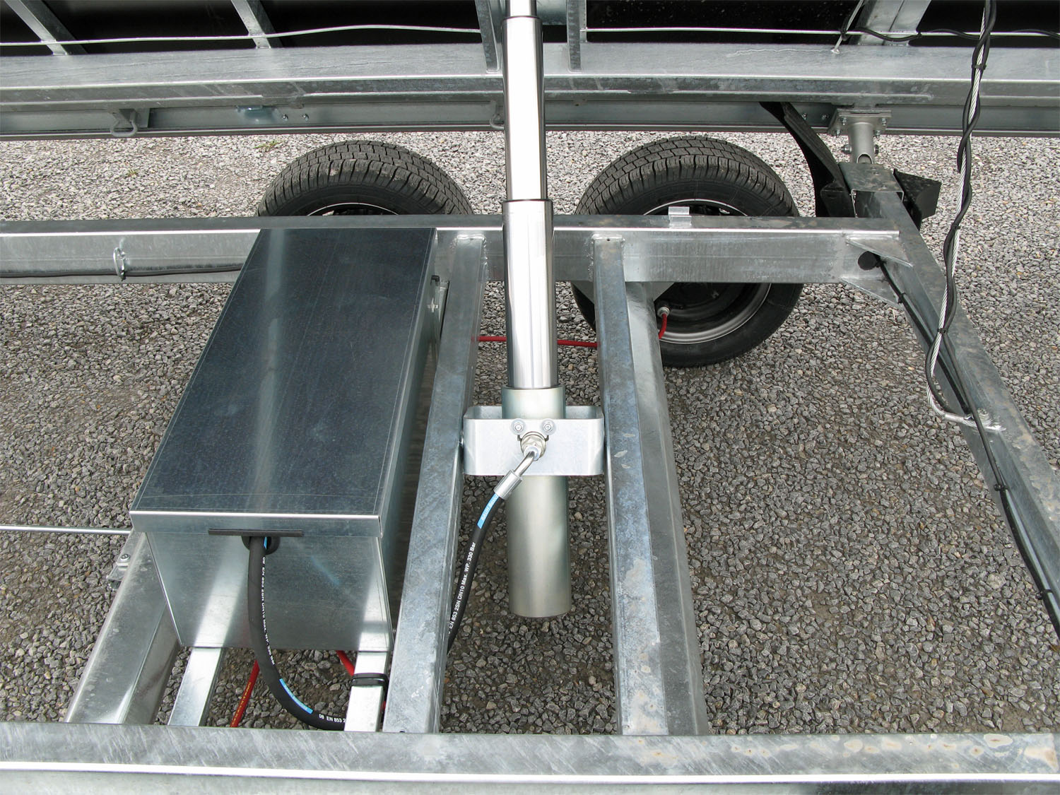 - Elektrohydraulik mit Funkfernbedienung im Behälter montiert, mit Batterie und Ladegerät