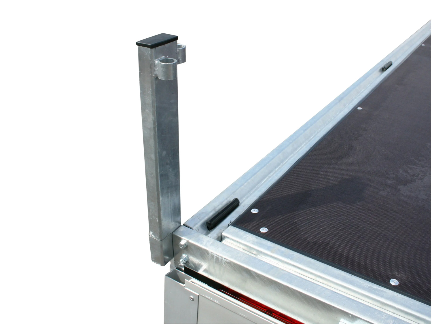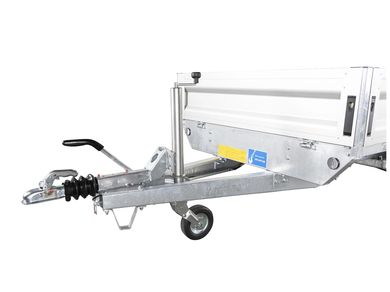 Der Anhänger ist mit 6 innenliegenden Zurrösen ausgestattet, sodass die Ladung sicher befestigt werden kann. Ein integriertes Verschlusssystem ermöglicht ein schnelles und sicheres Schließen der Bordwände, und ein Stützrad gehört serienmäßig zur leichteren Handhabung.