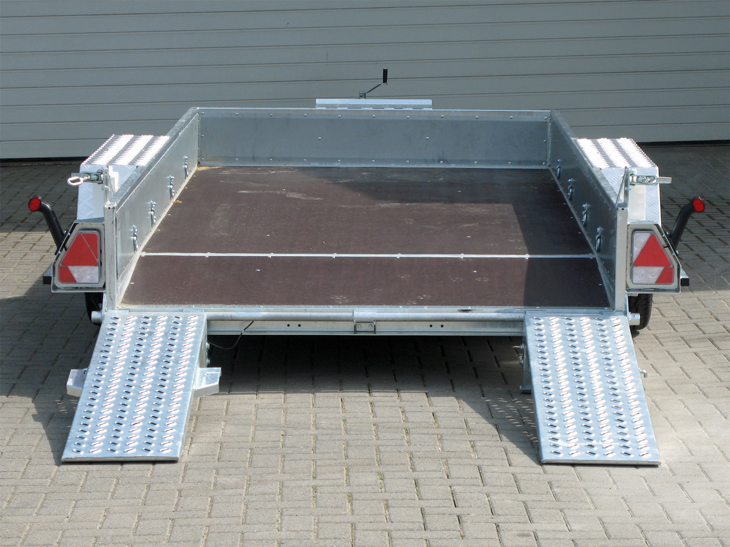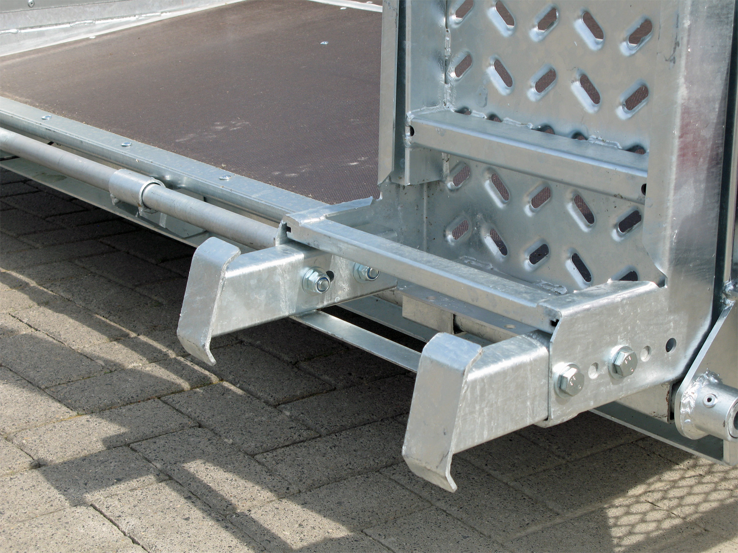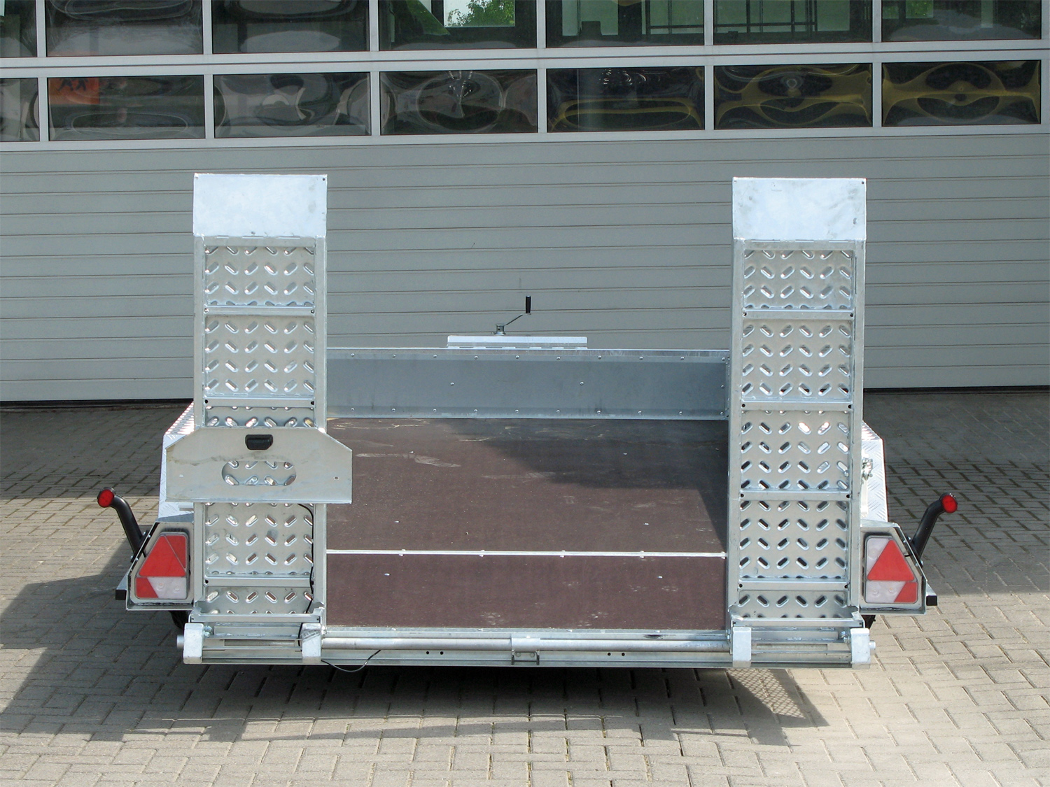 Mit einer Ladehöhe von nur 29 cm können alle Auffahrten problemlos bewältigt werden – egal ob es sich um eine Arbeitsbühne, Bagger, etc. handelt. Die Maxi-Load-Modell besitzen robuste Parabelfedern sowie ein voll verschweißtes und feuerverzinktes Fahrgestell. Der Anhänger ist als Standard mit 2 verschiebbaren Rampen ausgestattet. Es erlaubt somit einen nach hinten gerichteten Überhang und für eine angepasste Gewichtsverteilung. Alle Modelle können gegen Aufpreis mit kompletter Heckrampe geliefert werden. Stützbeine an den beiden Rampentypen sorgen für eine stabile Unterstützung beim Be- und Abladen. Die Rampenlänge ist 130 cm. Zur Serienausstattung gehören robuste Trittplatten an den Seiten, Verzurrösen, Schaufelablage und Stützrad. Die B4 Modelle sind außerdem mit Ersatzrad unter der Schaufelablage montiert.